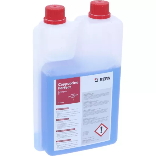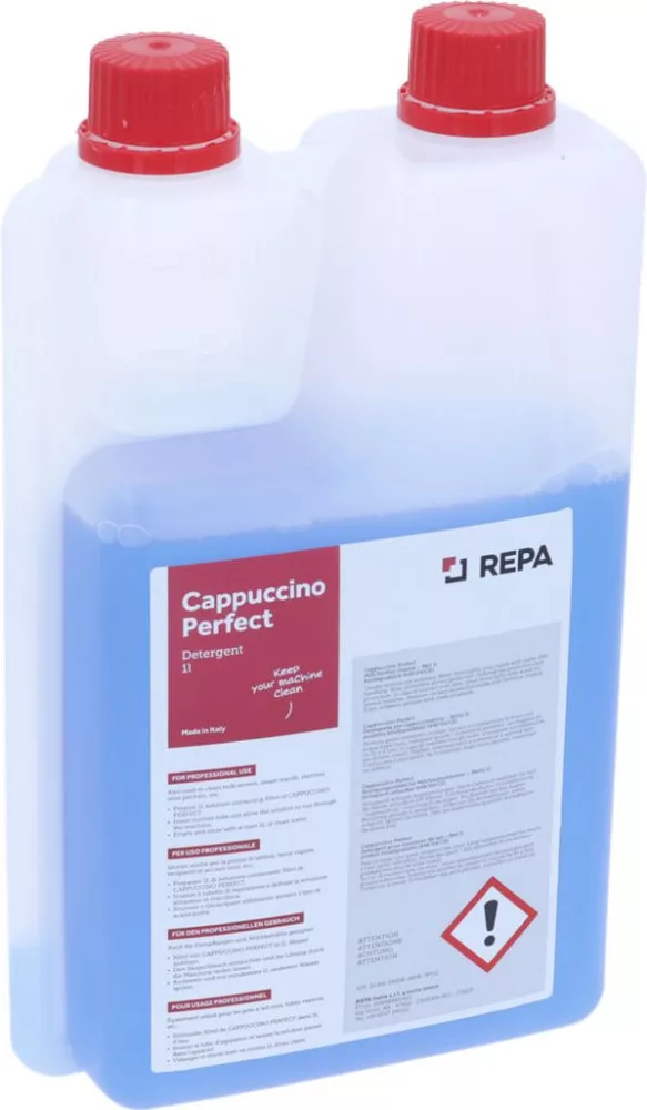 A REPA Cappuccino Perfect egy professzionális, kék színű, szagtalan tisztítófolyadék, amelyet kifejezetten a kávégépek tejrendszerének karbantartására fejlesztettek ki. Olaszországban gyártott, prémium minőségű vegyszer, amely kíméletlenül elbánik a makacs tejzsírral és a beszáradt fehérjelerakódásokkal a gőzorsókban, tejtartályokban és szívócsövekben.