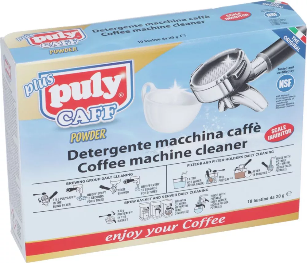 A Puly Caff Plus a világ egyik legelismertebb kávégép-tisztítószere, amelyet kifejezetten a professzionális felhasználók igényeire fejlesztettek ki Olaszországban. Ez a nagy hatékonyságú tisztító por pillanatok alatt feloldódik, és aktív oxigén segítségével távolítja el a kávézsírt, az olajos lerakódásokat és a kellemetlen szagokat a főzőegységből, a szűrőtartó karokból és a szűrőkből.