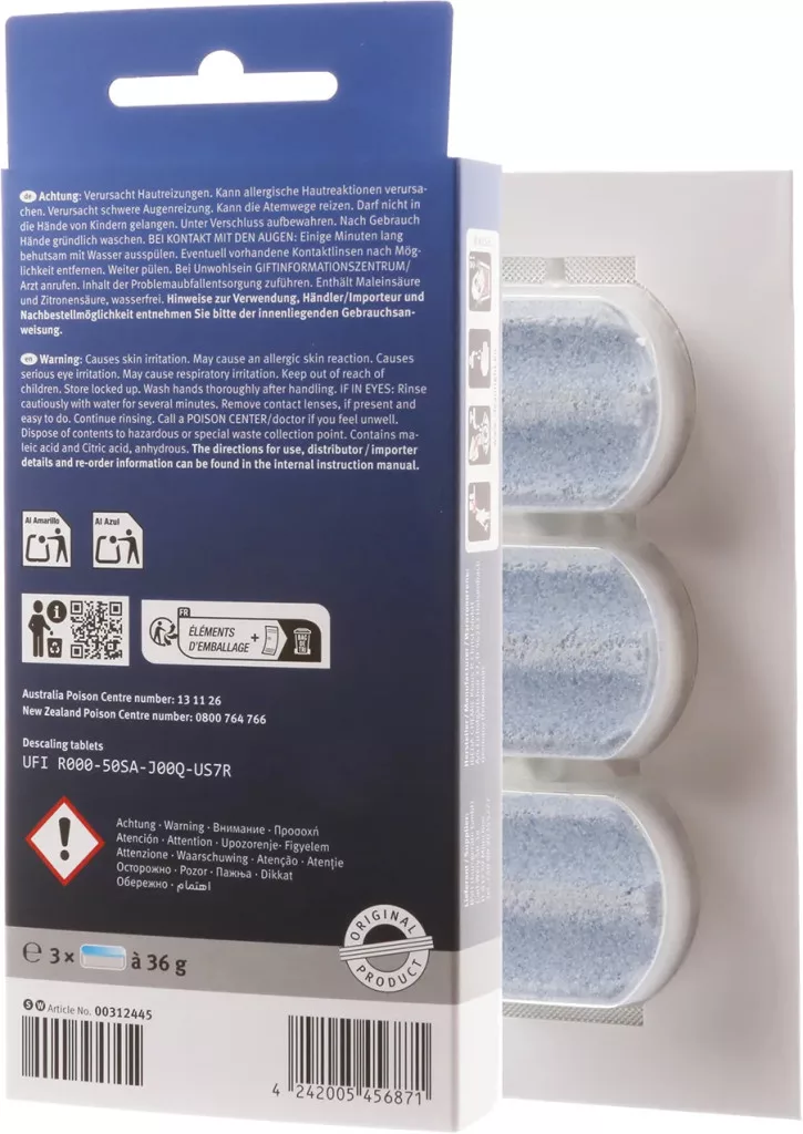 A csomag 3 darab, egyenként 36 grammos tablettát tartalmaz, ami három teljes vízkőtelenítési ciklusra elegendő. A tabletták egyik különlegessége a kék színjelzés: a tisztítási folyamat során a víz kékre színeződik, így a program végén vizuálisan is ellenőrizheted, hogy az öblítés sikeres volt-e, és maradt-e még tisztítószer a rendszerben.